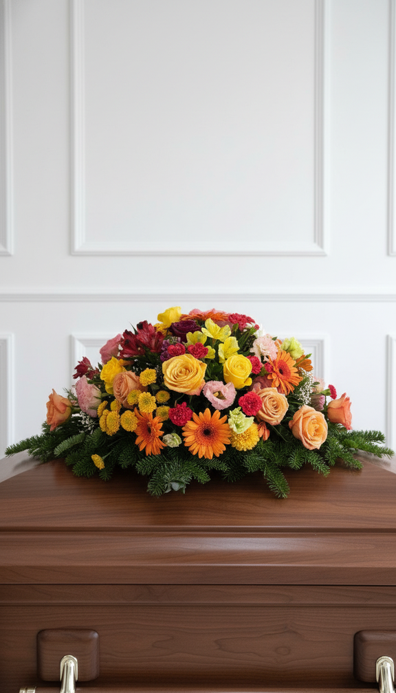 Warme Orangetöne stehen für Wertschätzung, Dankbarkeit und das Gedenken an ein erfülltes Leben. Dieses Trauerbukett verbindet Farbe mit Würde und bringt stilles Mitgefühl zum Ausdruck.