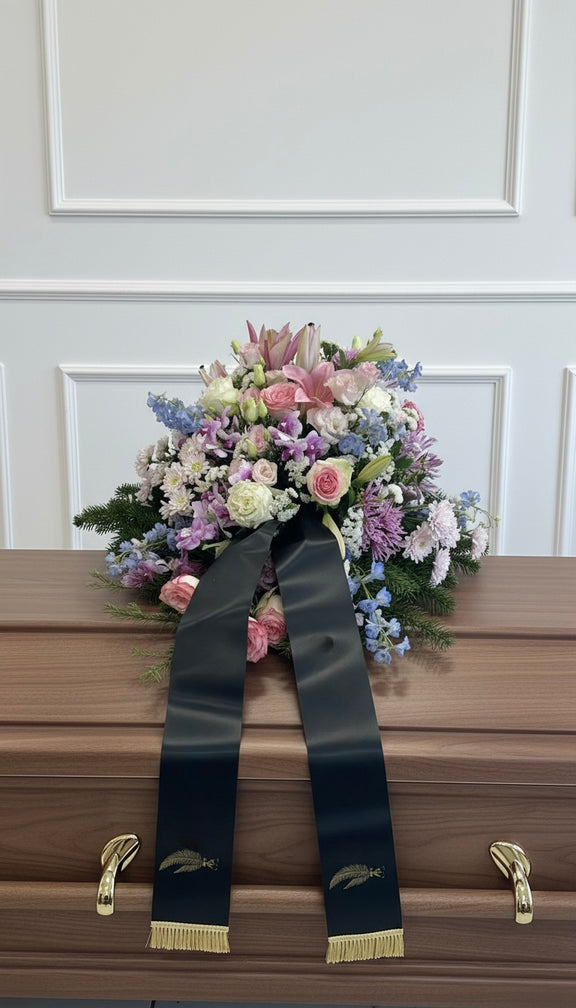 Das Trauerbukett in Pastellfarben wirkt ruhig, harmonisch und zurückhaltend. Die feinen Farbabstufungen vermitteln Trost und Anteilnahme und eignen sich besonders für eine dezente, stilvolle Verabschiedung.